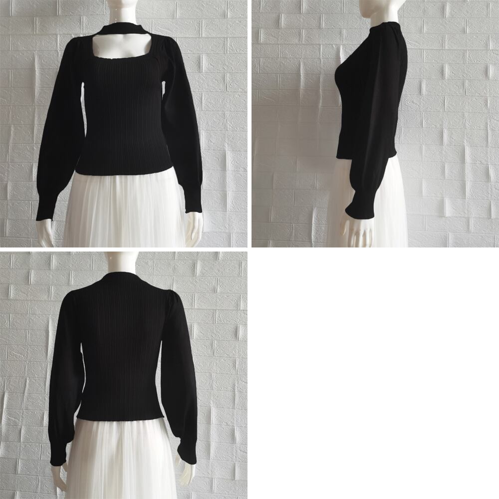 デコルテにカットを入れチョーカー風のネックに仕立てたニットトップス