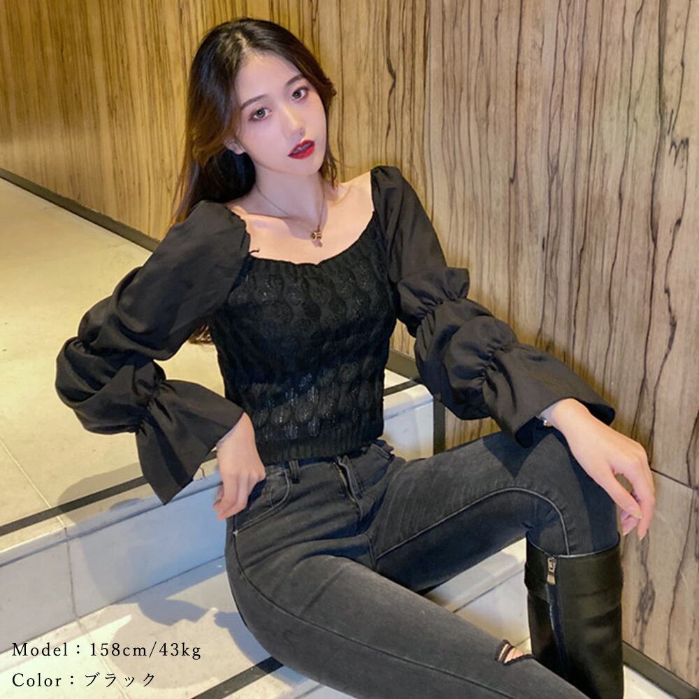 シャツブラウス スクエアネック レディース 長袖 ショート丈ニットトップス