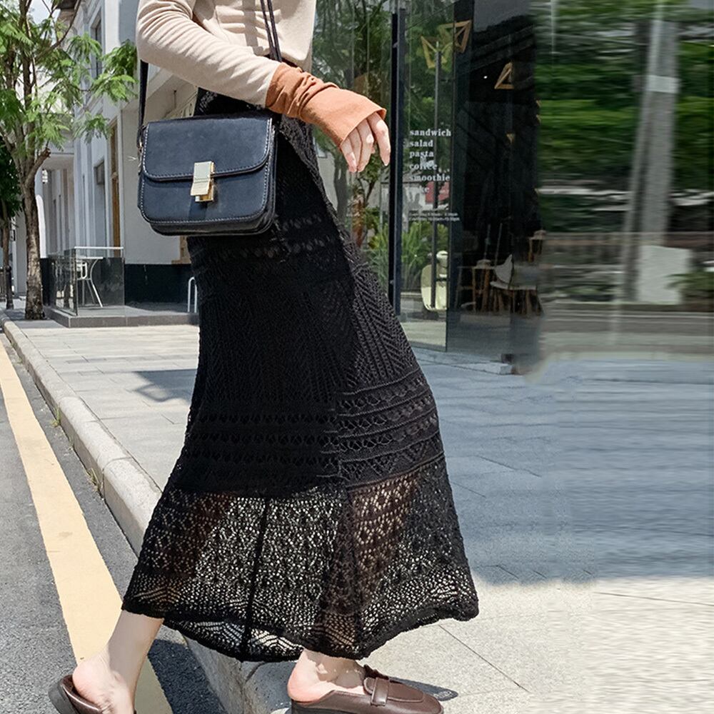 レディース 韓国風 ロングスカート かぎ編み タイトスカート 秋冬 きれいめ ミモレスカート フェミニン 透け感