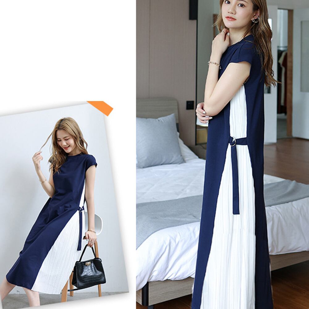 半袖ロングワンピース 配色ワンピ オフィス カジュアル 大人かわいい Aライン フレア シンプル 体型カバー 通勤