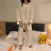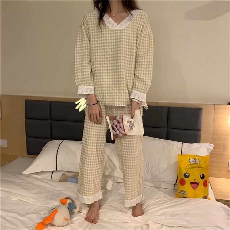 春 秋 レース 縫付 格子縞 長袖 Vネック ルームウェア セット 可愛い 小さい新鮮な 学生
