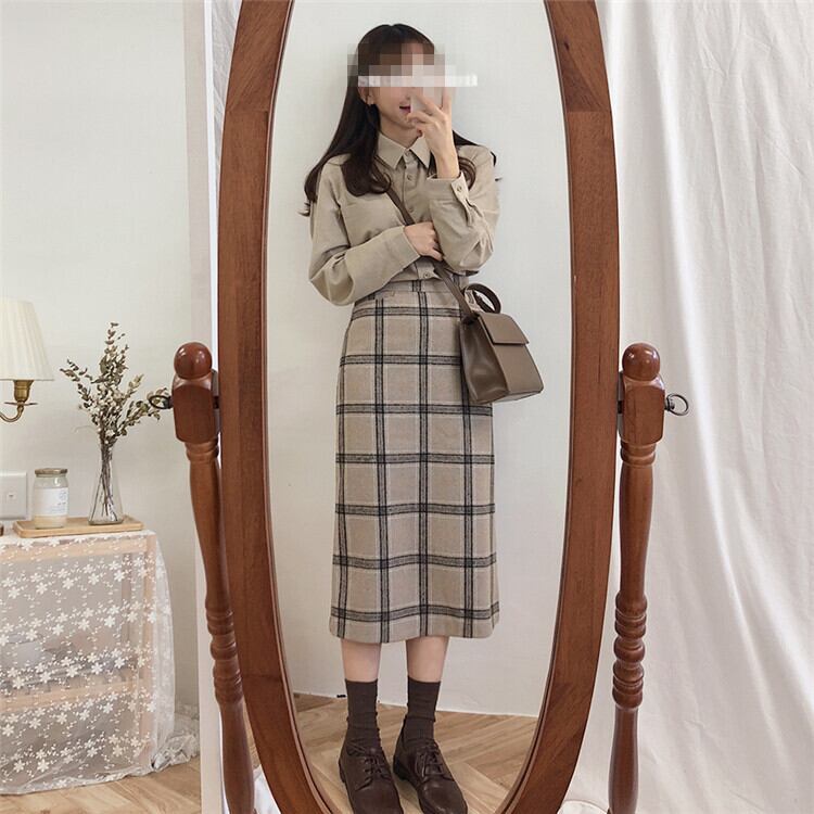 レトロ ウール 百掛け スプリット チェック柄 ハイウエスト スリム スカート